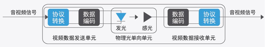 2) 物理光单向传输单元,是产品核心部件,其包含发光模块和感光模块,发光模块实现将音视频发送单元传输过来的电信号数据转换成光信号,以不可见光的形式投射给感光模块;感光模块是将光信号进行解析,转换成可用的电信号传输给后端的音视频数据接收单元;
